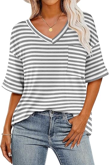 Oversized Tshirts for Women Striped Half Sleeve V Neck Tee Shirt Casual Loose Fit Tops Summer T-Shirts Tunic