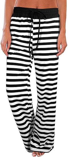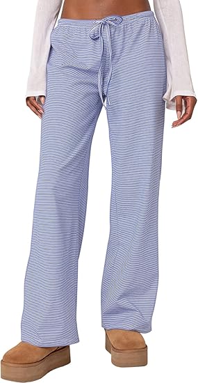 Women's Wide Leg Striped Pants Casual Drawstring Elastic Low Rise Pajama Pants Lounge Wear Trousers