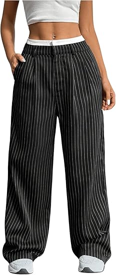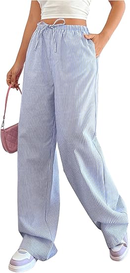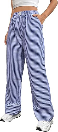 Stiped High Waist Pants for Women Loose Lounge Pants Straight Leg Trousers Pants with Pocket