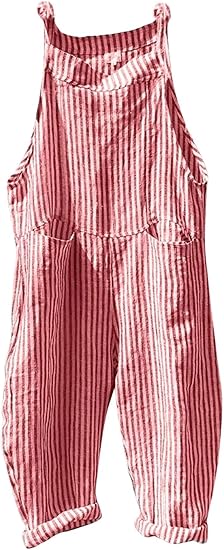 Womens Casual Striped Overall Jumpsuits Relaxed Fit Baggy Adjustable Straps Bib Wide Leg Pants