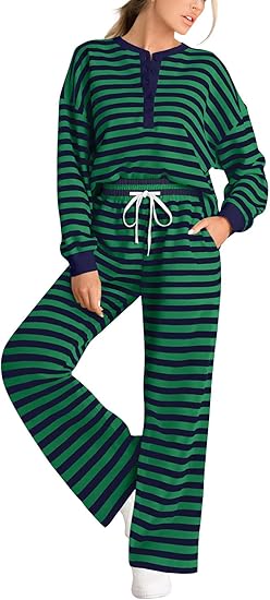 Women 2 Piece Striped Lounge Set Button Sweatshirt Matching Pants Set Causal Tracksuit Outfits Loungewear