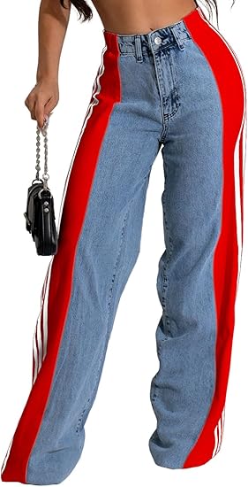 Womens Jeans High Waisted Wide Leg Striped Patchwork Color Block Stretchy Loose Straight Denim Pants