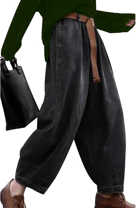Women Casual Loose Cropped Trousers Pants Denim Bloomers Elastic Waist with Pockets PJD