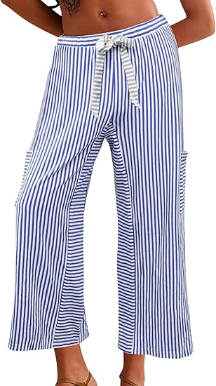 Women's Wide Leg Lounge Pants Striped Mid Waisted Drawstring Beach Pants Capri Pants Trousers with Pockets
