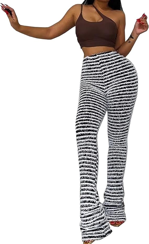 Women's Stacked Leggings Striped Fuzzy Knitted Extra Long Pants High Waisted Skinny Flare Pants Streetwear